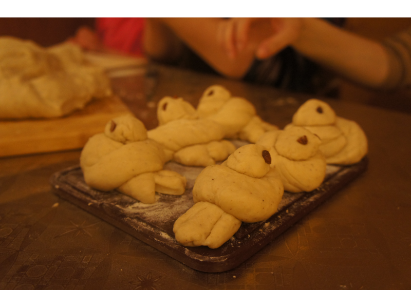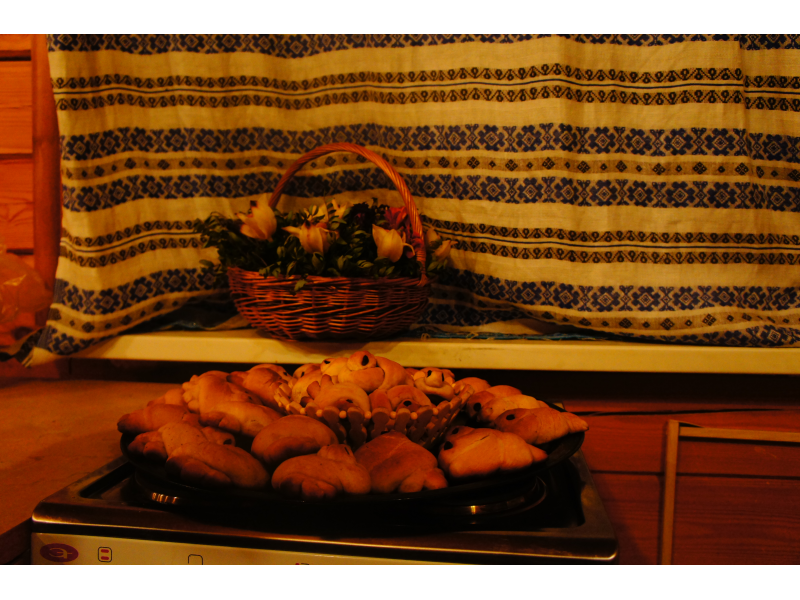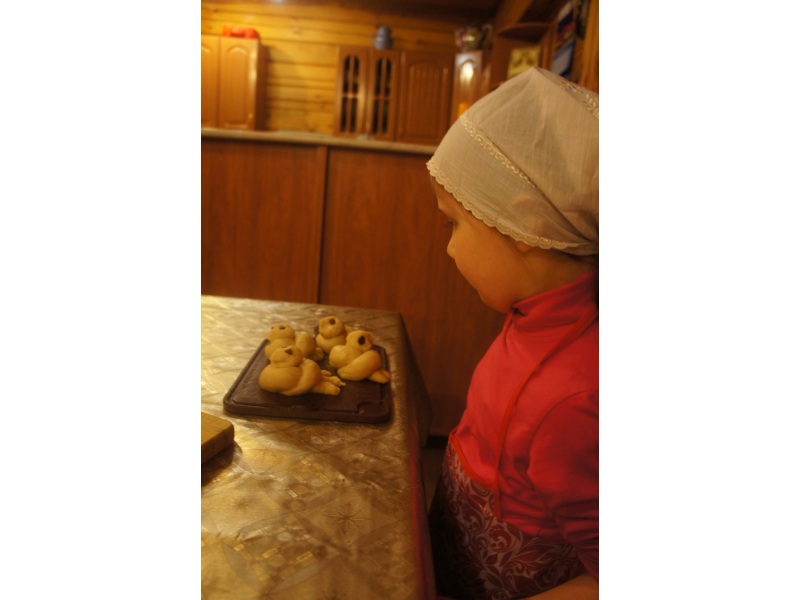 Готовых птичек «сажали» на окно, а часть из них отдавали детям для их забав. Дети печеных птичек цепляли на длинные пруты, несли на самую высоку горку и кричали что есть мочи: «Весна-красна, на чем пришла? — На сохе, на бороне, на овсяном снопу, на ржаном скирду». Или: «Солнышко-ведрышко, выгляни в окошко. Солнышко, нарядись, Красное, покажись! Пошли нам, Господи, теплого лета, урожайного года и побольше света!».