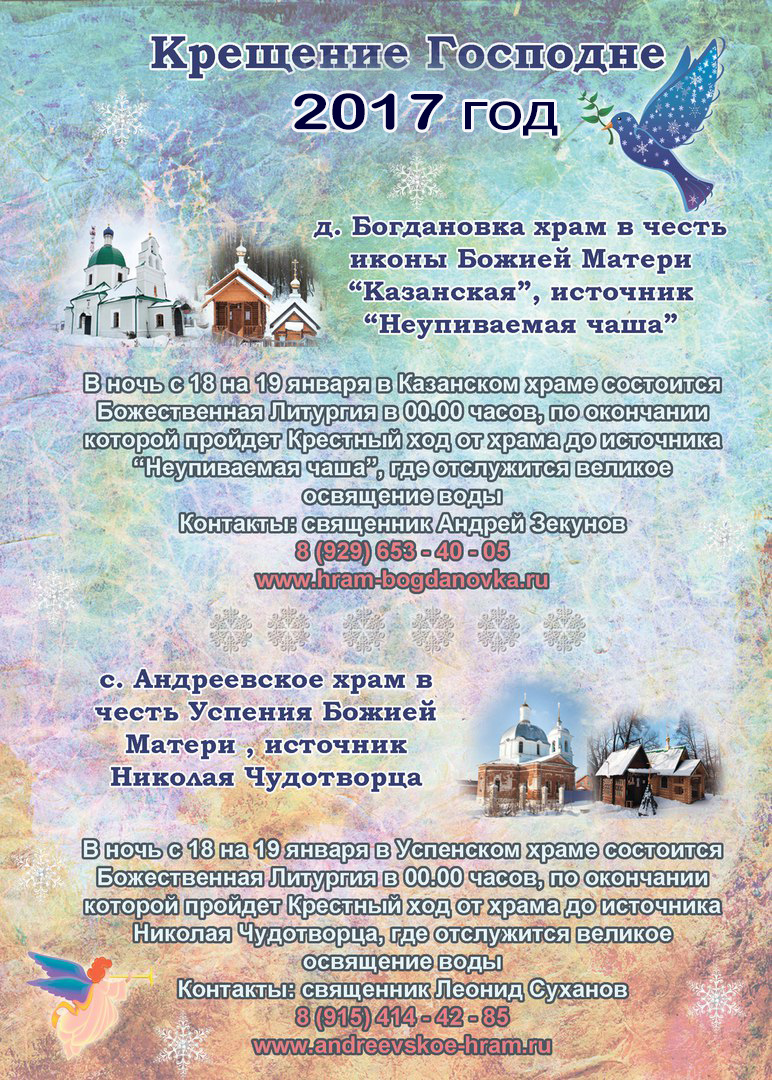 18 января в 8.00 в Казанском храме водосвятный молебен, в 22.00 - Всенощное бдение.