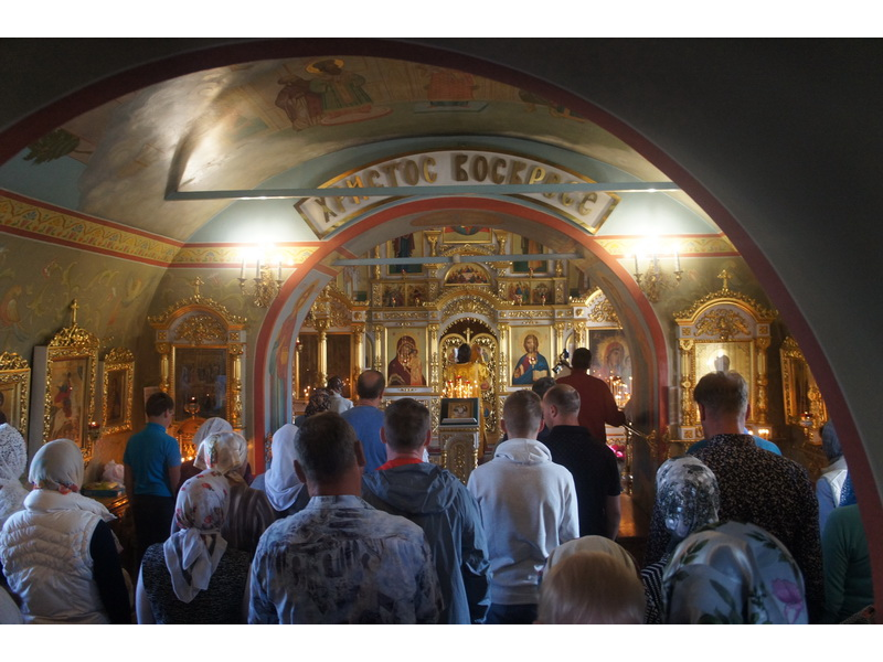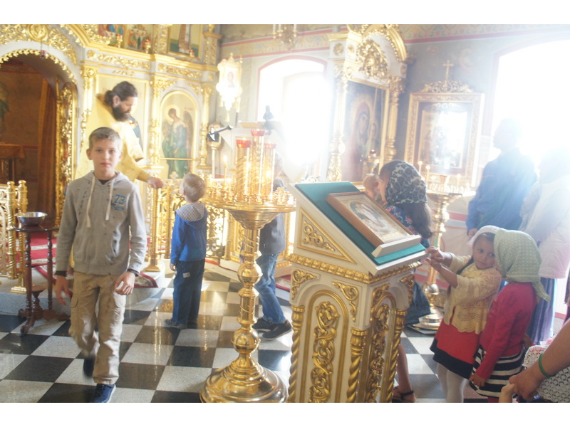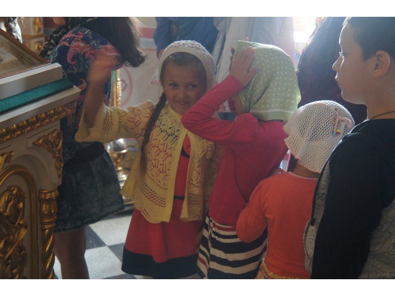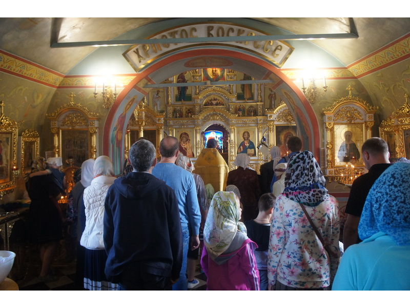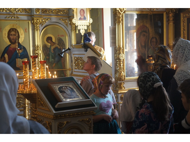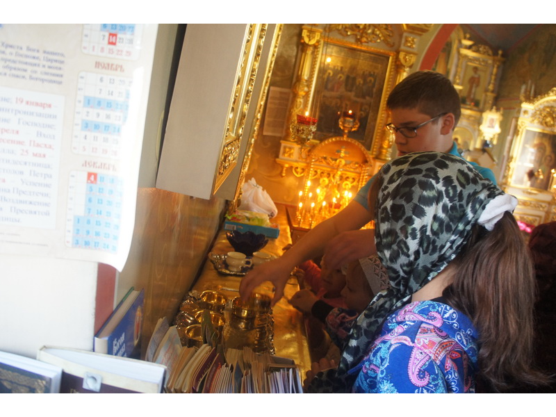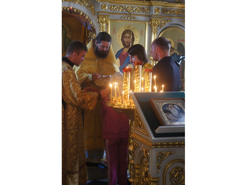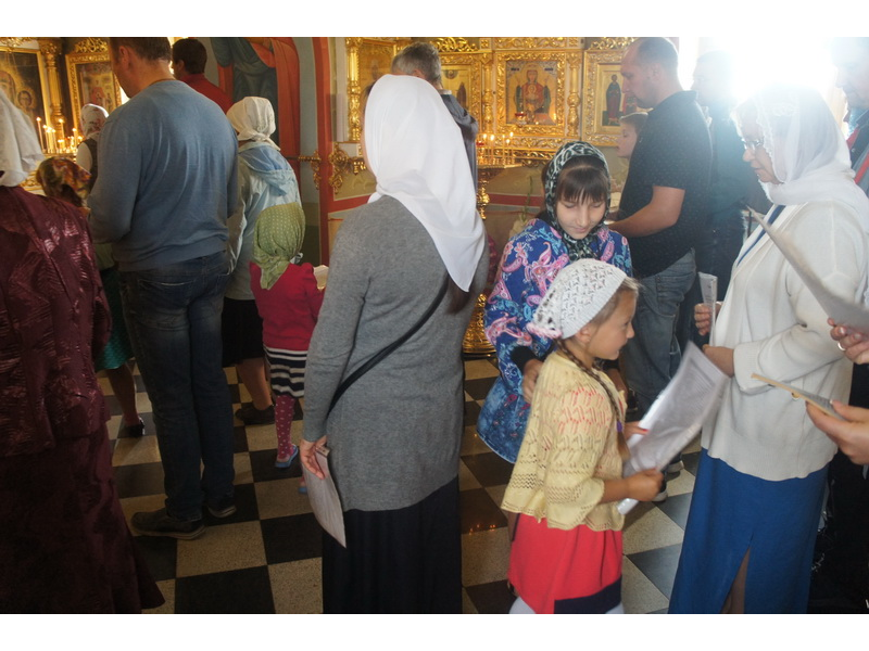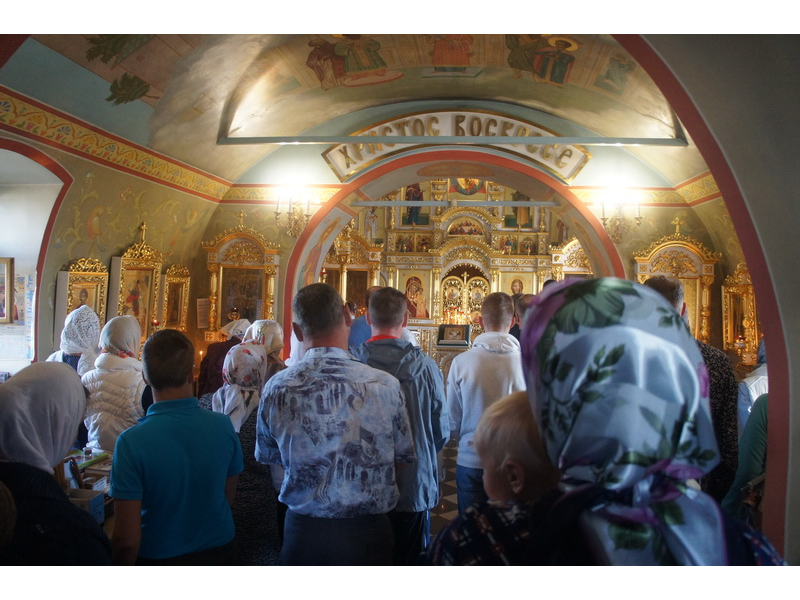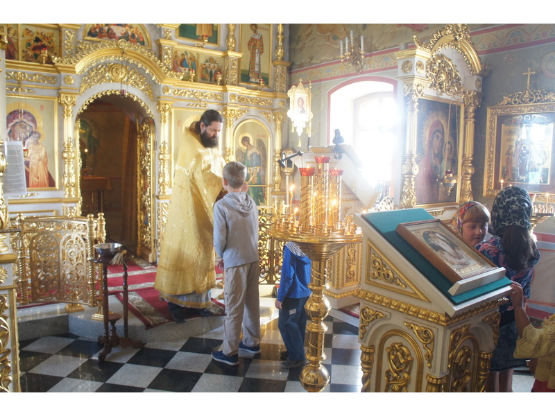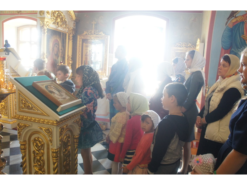 Воскресный день на приходе прошел очень активно. Утром после Божественной Литургии был отслужен молебен для учащихся. В обед нас посетили паломники из Москвы, им была проведена экскурсия по храму и предложена домашняя трапеза. Вечером была отслужена всенощная, после которой детки направились на источник и полакомились сладкими угощениями и дыней. Икону к празднику в храме украшали воспитанники воскресной школы, а также готовили сладкие угощения.