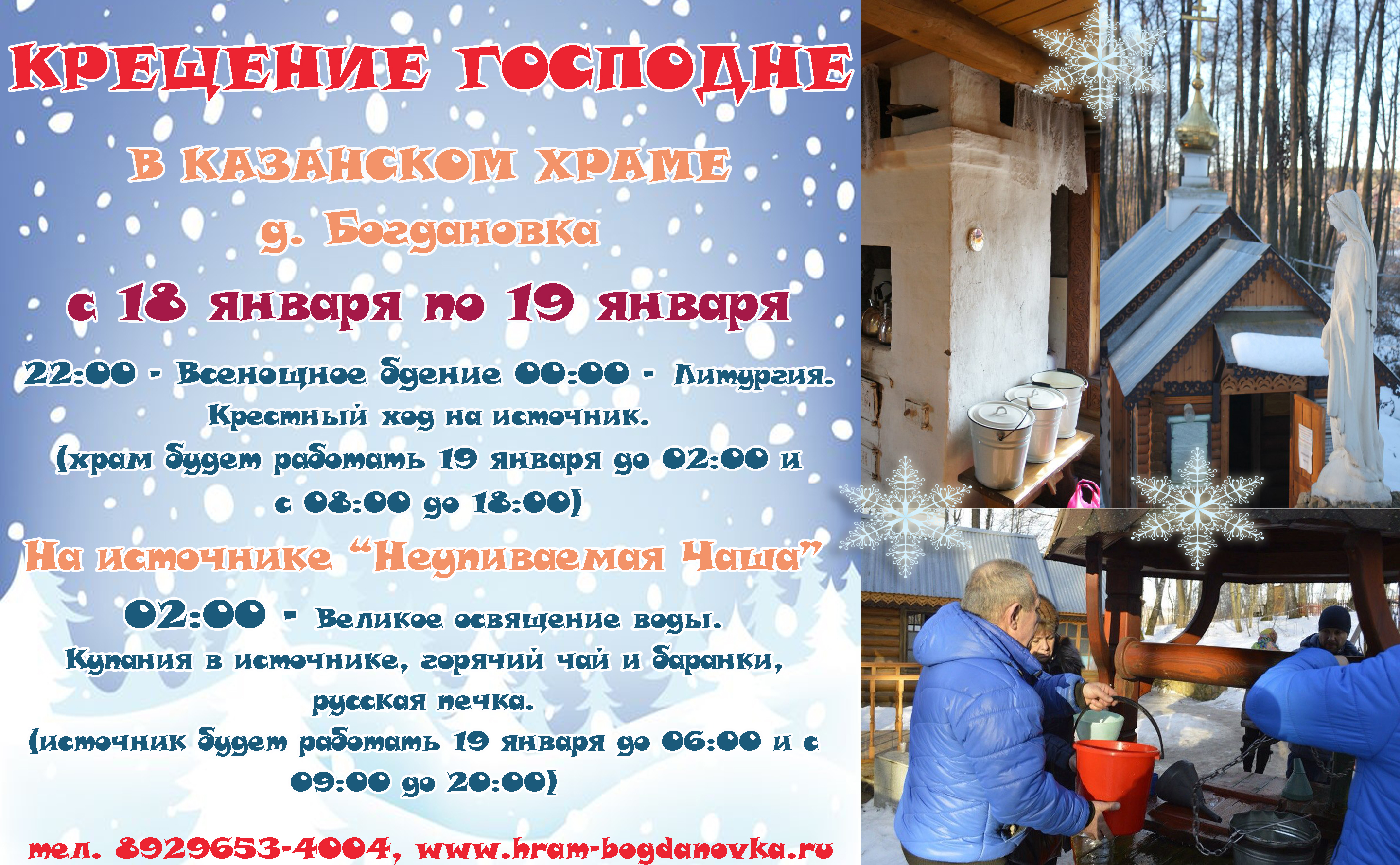С 18 по 19 января в храме 22.00 - Всенощное бдение, 00.00- Литургия, крестный ход на источник, 02.00- Великое освящение воды на источнике, купания, горячий чай и баранки.