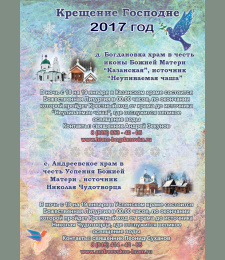 18 января в 8.00 в Казанском храме водосвятный молебен, в 22.00 - Всенощное бдение. 19 января в 00.00 - Божественная Литургия