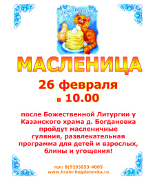 Приглашаем всех!!! 26 февраля в 10.00 после Божественной Литургии у Казанского храма д. Богдановка пройдет масленичное гуляние, детская программа для детей и взрослых, блины и угощения!!!