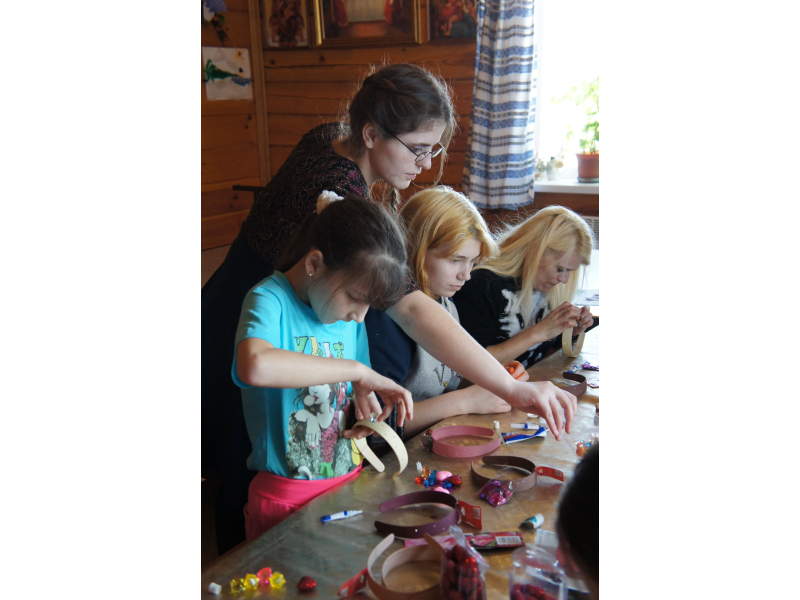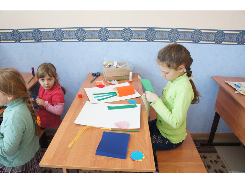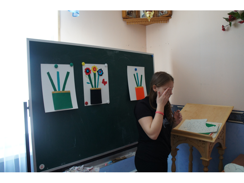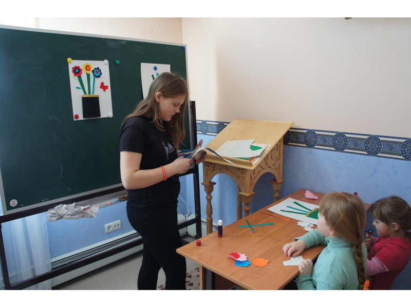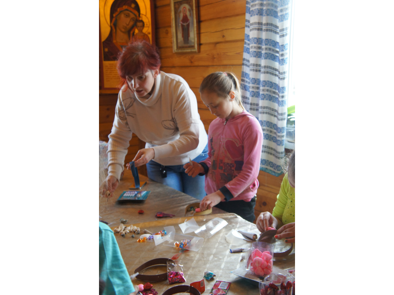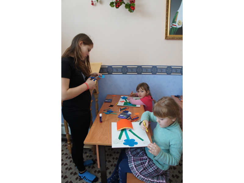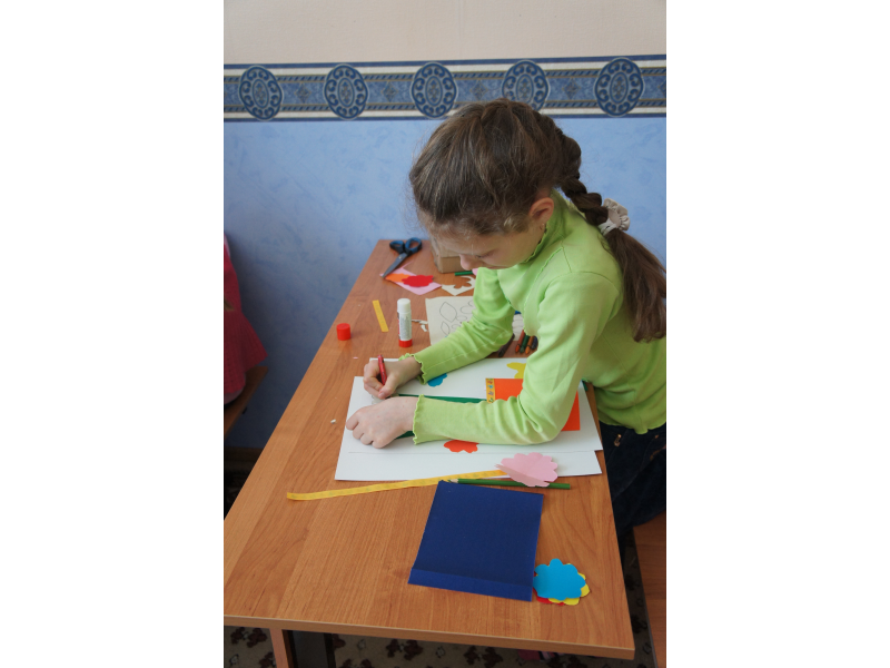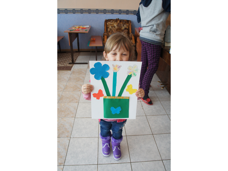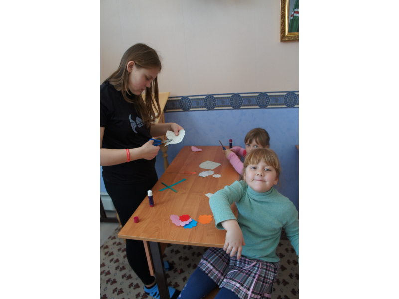 Также в творческой мастерской под руководством Оксаны младшая и старшая группа готовили сувениры для мам и сестренок - головное украшение своими руками. Младшая группа под руководством начинающего педагога Ирины занималась созданием из цветной бумаги красочных аппликаций.