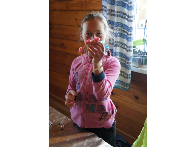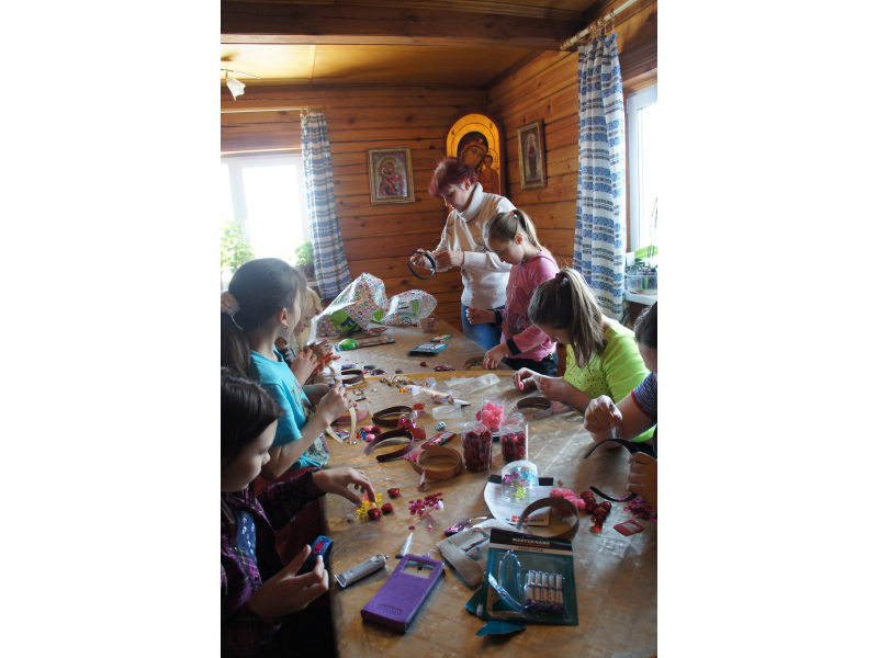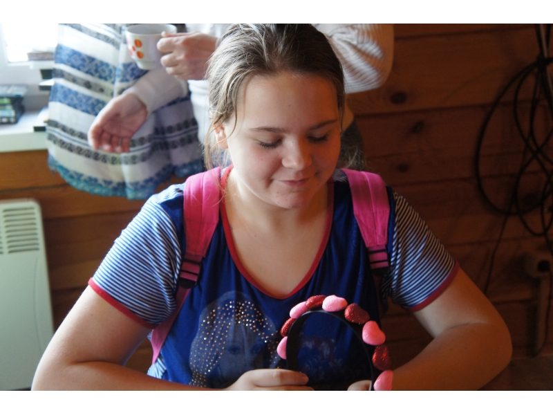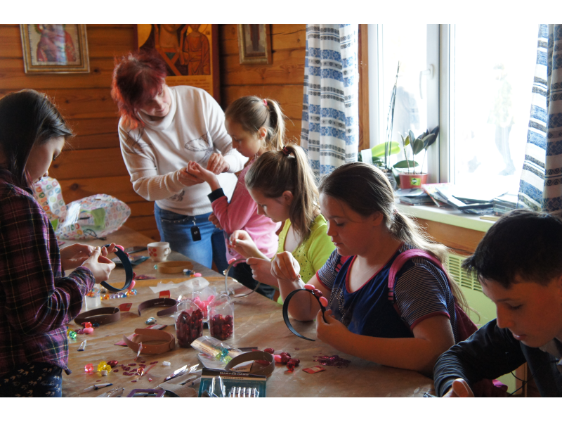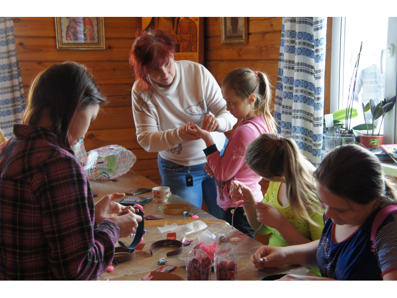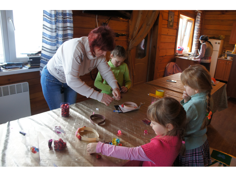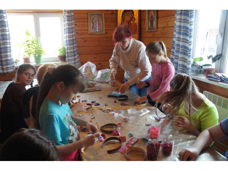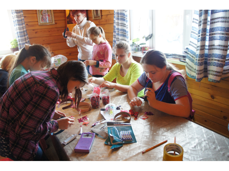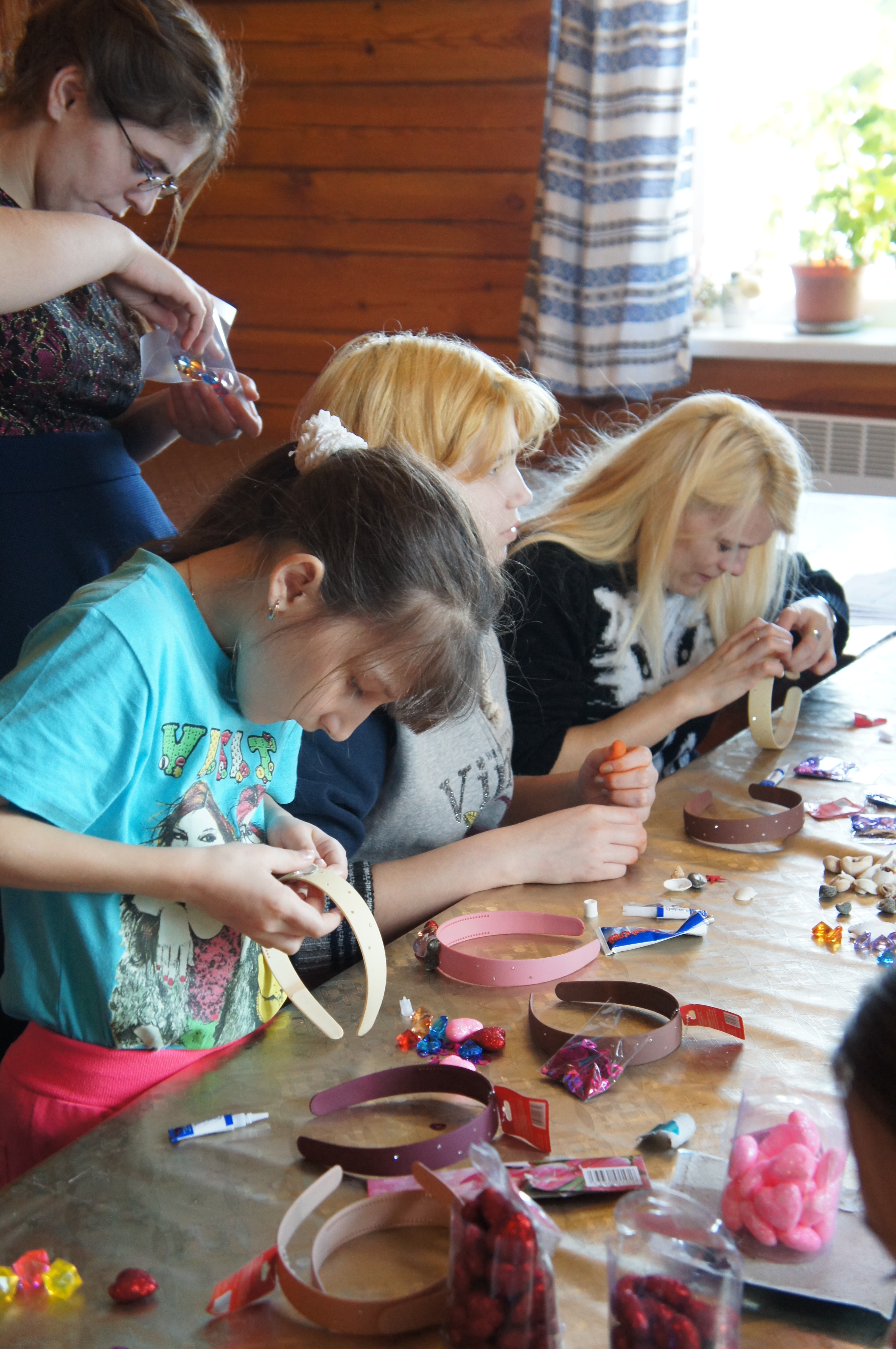 Также в творческой мастерской под руководством Оксаны младшая и старшая группа готовили сувениры для мам и сестренок - головное украшение своими руками. Младшая группа под руководством начинающего педагога Ирины занималась созданием из цветной бумаги красочных аппликаций.
