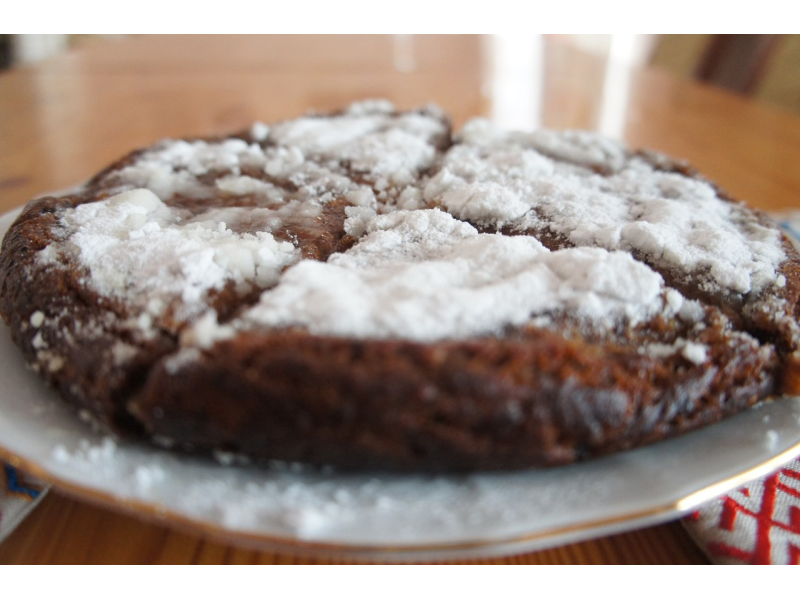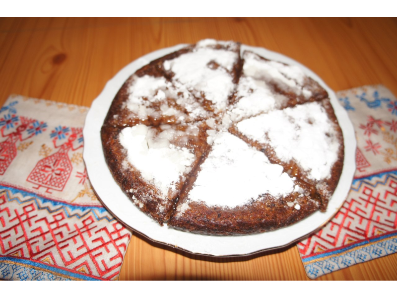 Постная коврижка. Мука, подсолнечное масло, варенье, какао, чернослив, лимон, курага, грецкие орехи, вода.