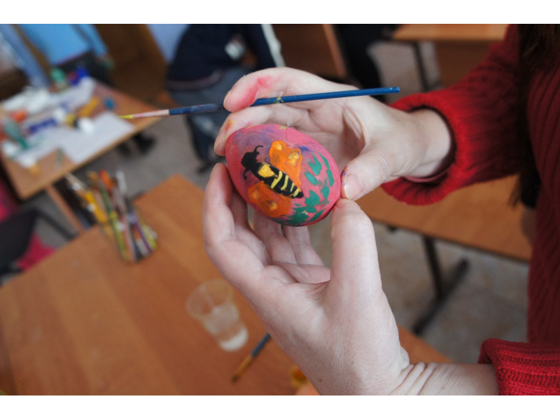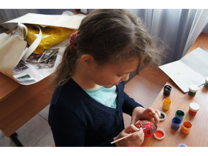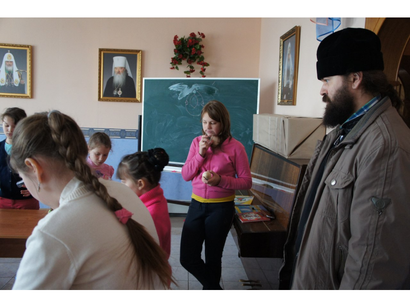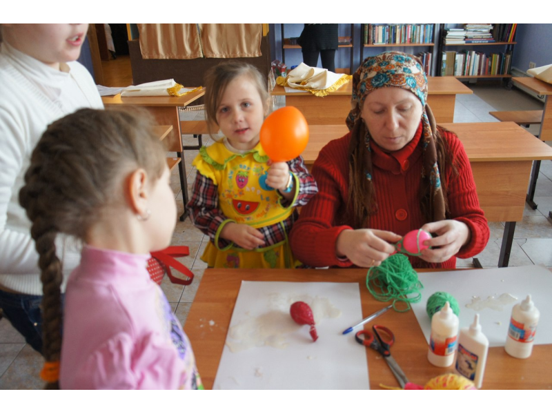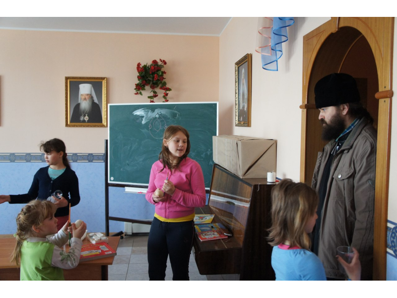 Продолжаем подготовку к Пасхе! Елена Владимировна обучает деток, рисованию на деревянных яичках, а также поделкам из ниток, из которых должны получиться воздушные игрушки. У каждой поделки свой узор, яркость цвета и индивидуальность композиции. Как наши рисунки высохнут покроем их лаком и на Пасху будут подарки для родителей. Дети похвастались о. Андрею своими шедеврами!