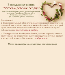 1 ноября в поддержку акции «Согреем детские сердца» воскресная школа «Ангел мой» при Казанском храме д. Богдановка и МОУ Проводниковская средняя общеобразовательная школа им. Героя России Маслова А.С. - раздали собранные вещи, подарки и сладости детям из многодетных семей, а в д. Богдановка их четыре.