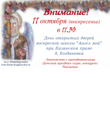 Сообщаем вам о переносе Дня открытых дверей воскресной школы "Ангел мой" на 11 октября (воскресенье) в 11.30!!! Ждем Вас на торжественный праздник рождения нашей воскресной школы!!! В программе открытия: - знакомство с преподавателями - детский праздник (игры, конкурсы, состязания) - чаепитие